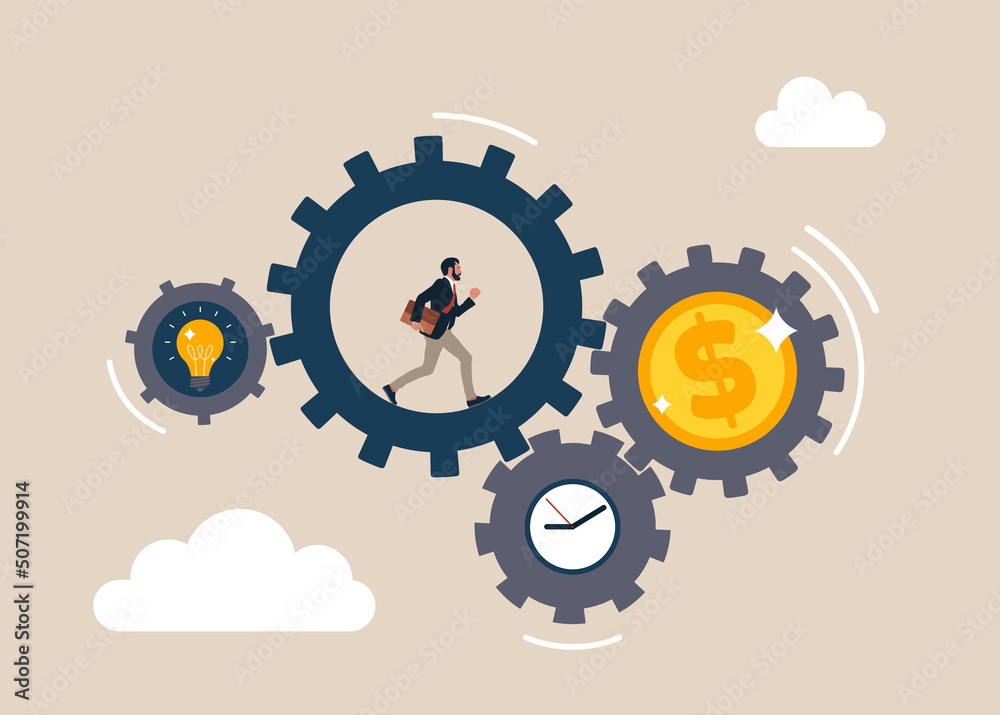 Photos Businessman running with full effort inside gear cogs to spin time and money gears