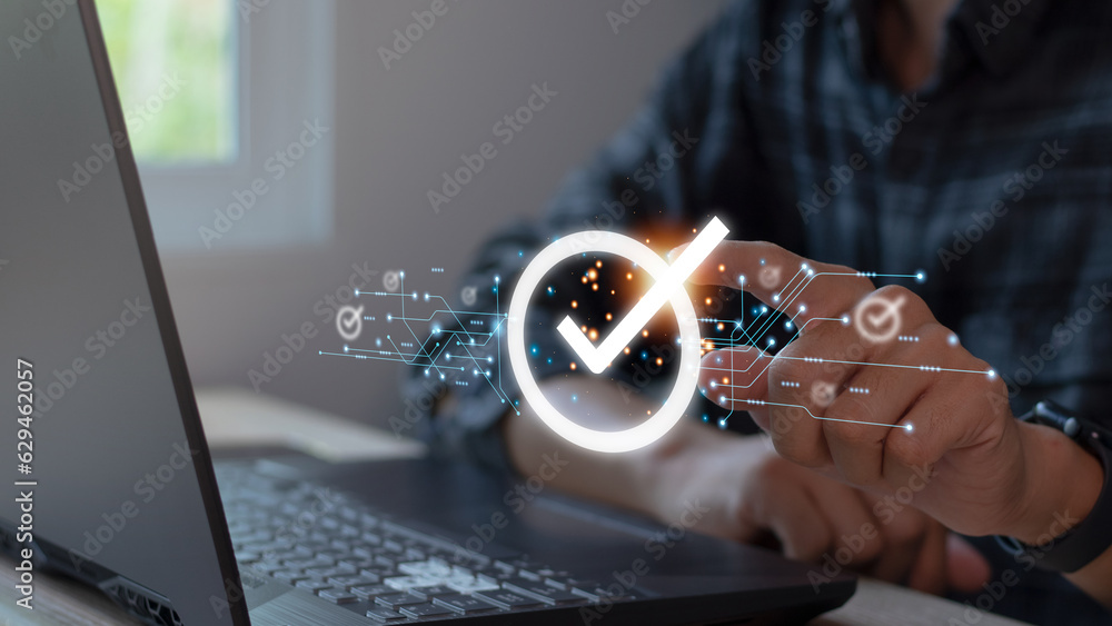 Businessman touching check icon on virtual screen, check concept for business process automation Quality Assurance Management