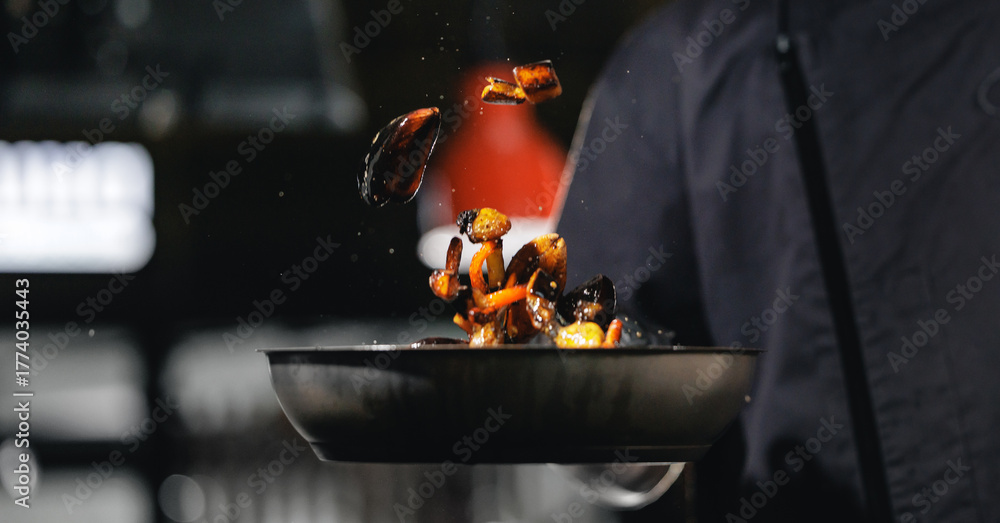 Photos Chef in dark apron flipping sauteed vegetables in frying pan