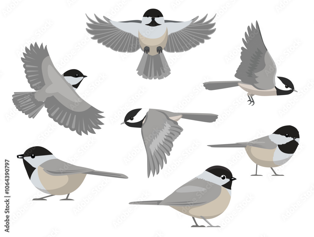 Photos Chickadee Bird Black-capped Tit Winter Various Poses Cartoon Vector Character