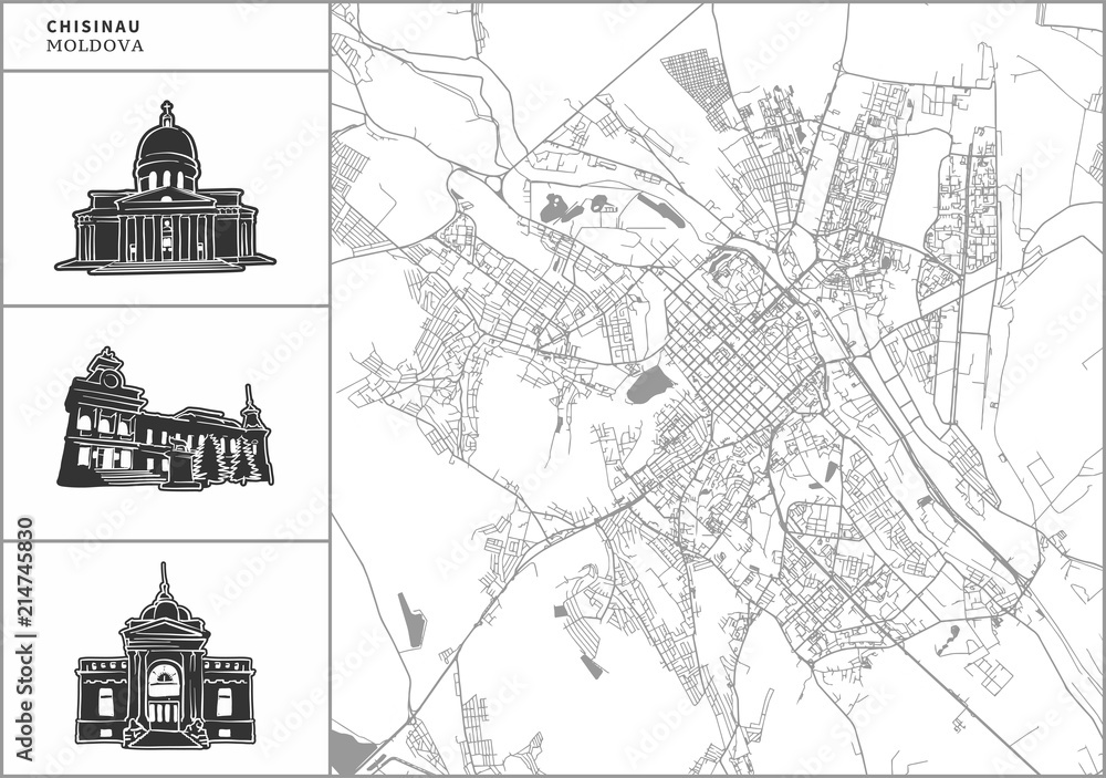 Tableau sur toile Plan de la ville de Chisinau avec icônes d'architecture dessinées à la main