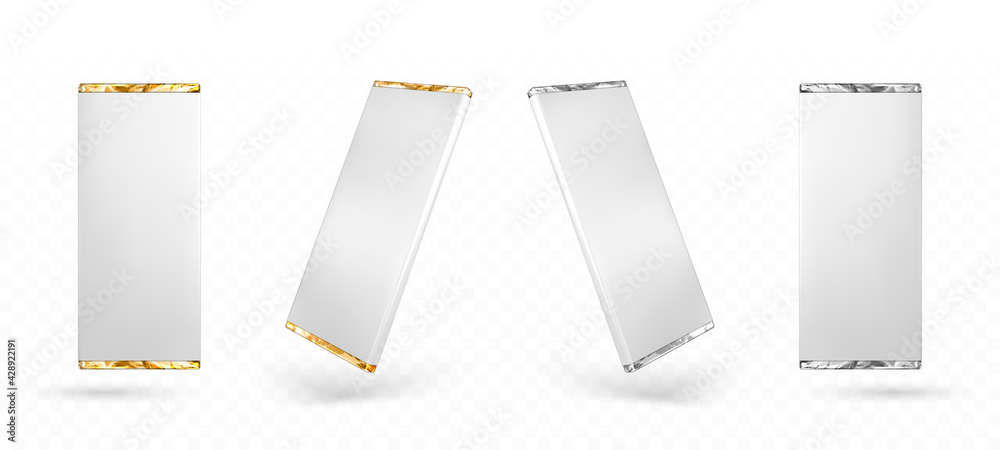 Tableau sur toile Chocolate package with gold and silver foil 3d mockup, blank pack for choco bar top and angle view