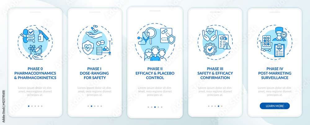 Clinical examination phases onboarding mobile app page screen with concepts. Dosage, efficiency walkthrough 5 steps graphic instructions. UI, UX, GUI vector template with linear color illustrations