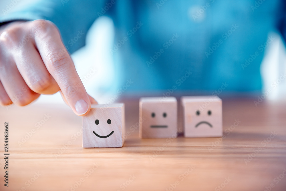 Tableau sur toile Close up customer hand choose smiley face and blurred sad face icon on wood cube, Service rating, satisfaction concept