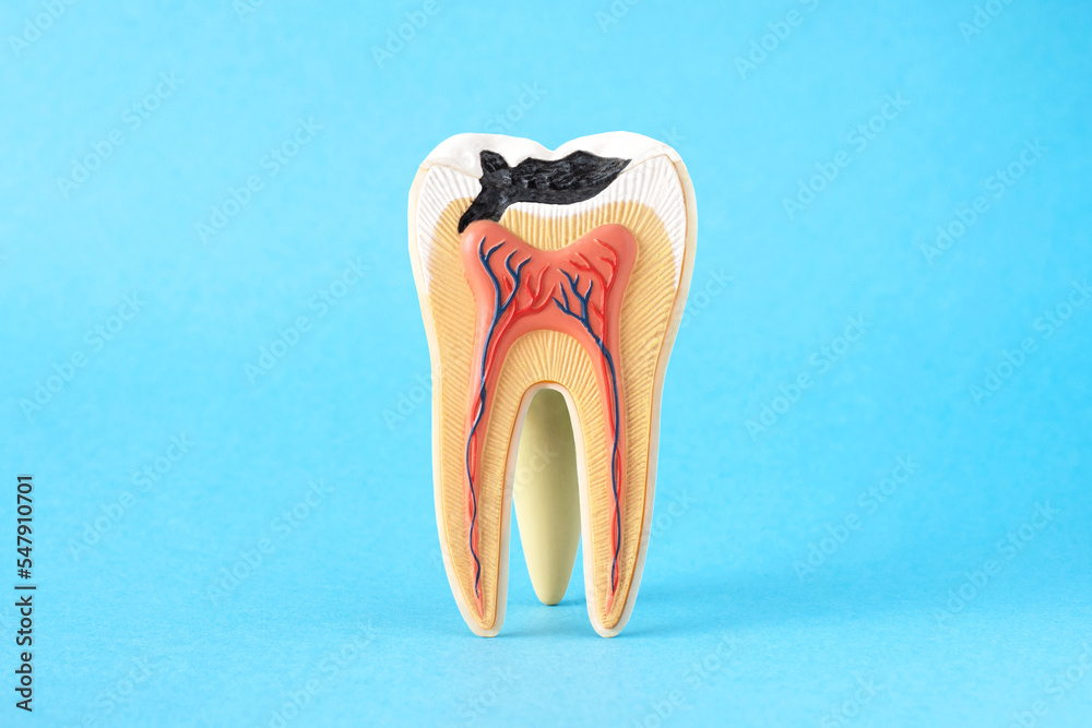 Photos Close-up internal tooth structure model with fisrt step of caries decay on blue