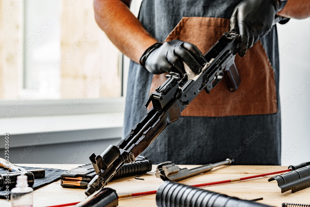 Photos Close up of a man in apron wiping his firearm with a cloth