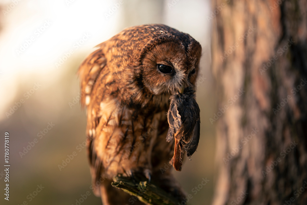 Photos Close up of Tawny owl (Strix aluco) eating by small bird prey dead song bird on dry branch next tree trunk low under crown