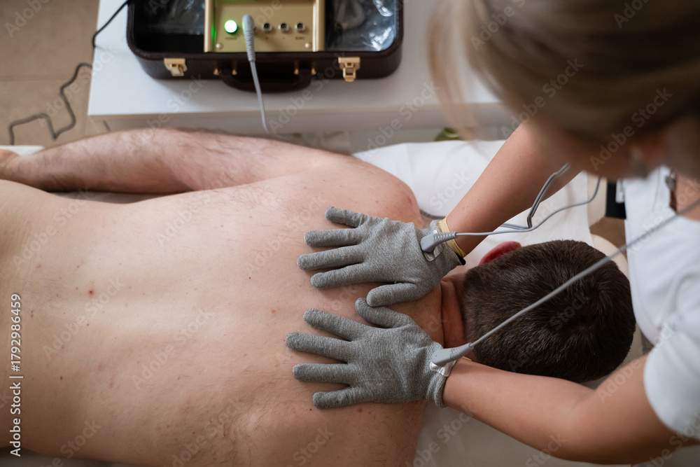 Photos Close up view of a therapist applying electrotherapy with special conductive gloves on a man back during a physiotherapy session
