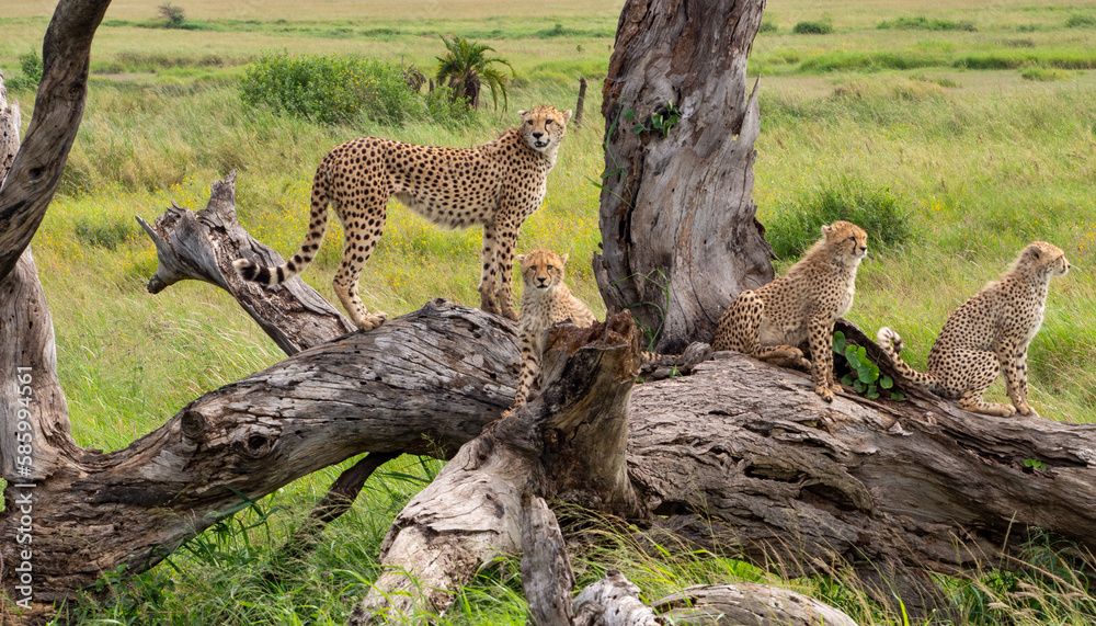 Tableau sur toile Coalition of cheetahs on a tree looking for prey in Serengeti National Park, Tan