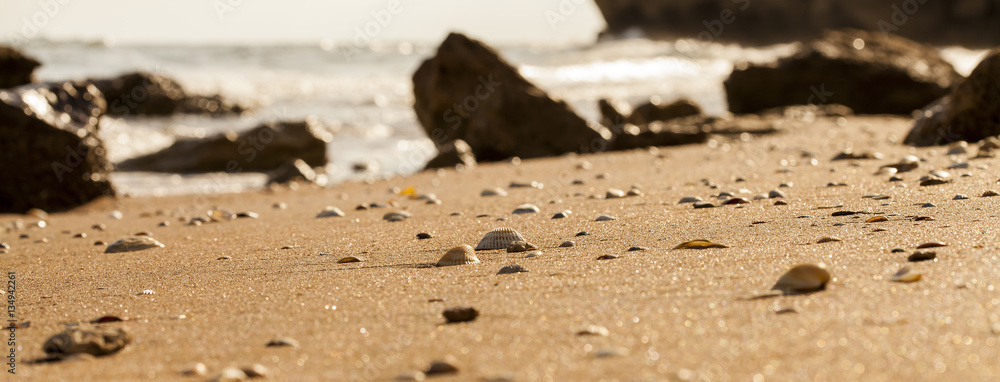 Photos cockleshells on sand of the Sea of Azov