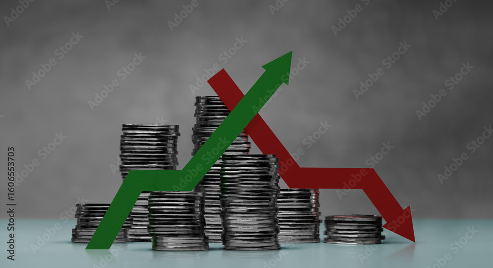 Tableau sur toile Coins Stacked with intersecting red green arrows represent financial volatility