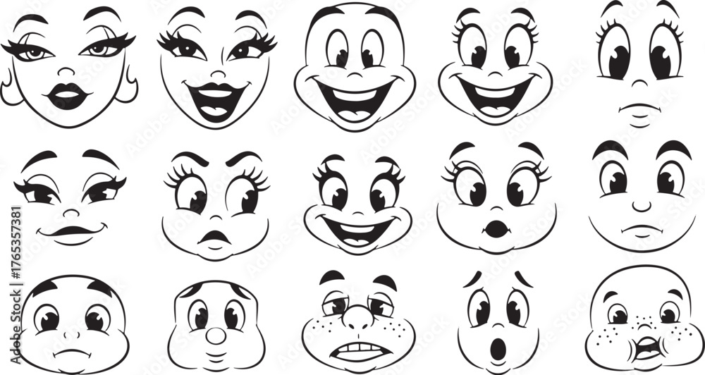 Tableau sur toile Collection of 15 Cartoon Faces Expressing Various Emotions and Expressions drawi