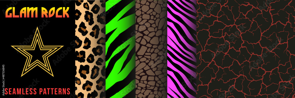 Photos Collection of 80's Glam Rock Metal seamless patterns | Set of abstract vivid vector texture graphics in retro vintage style for apparel and textiles