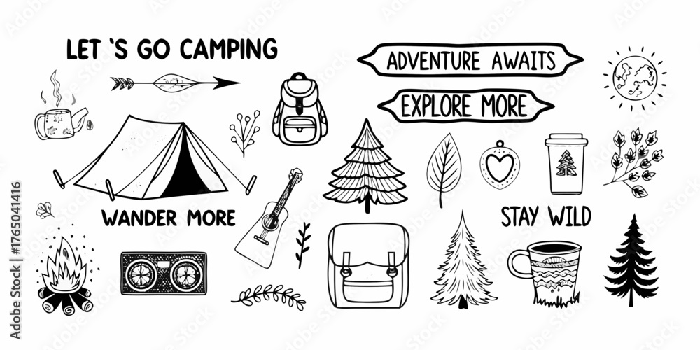 Tableau sur toile Collection of hand drawn camping and adventure icons with inspirational text phr