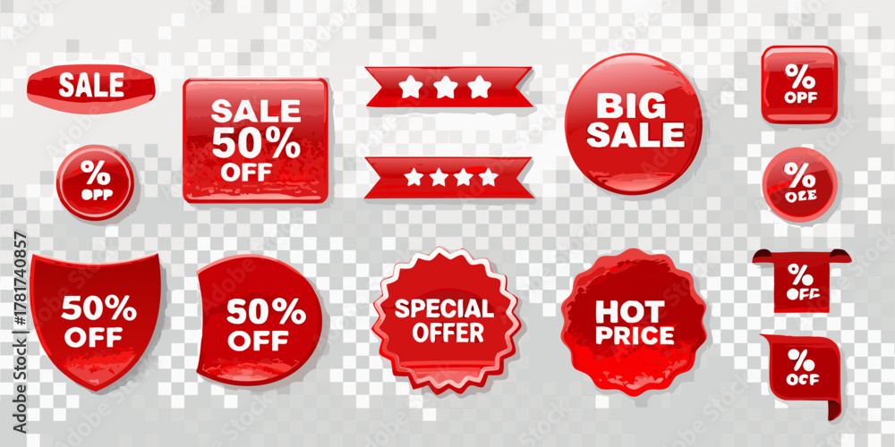 Photos Collection of red sale and discount tags and labels with various shapes and text