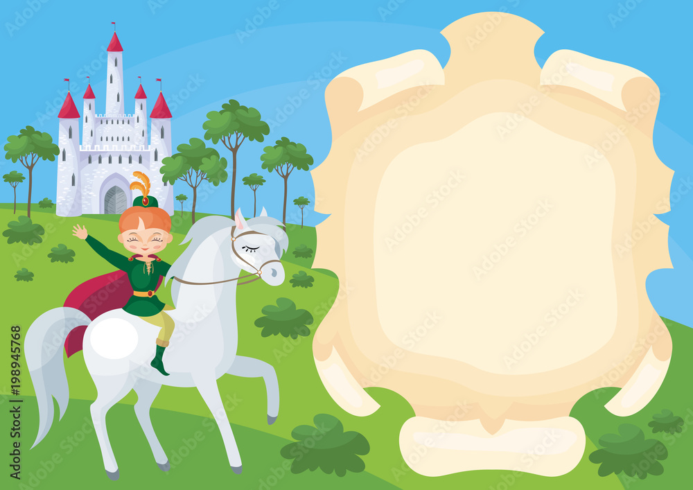Photos Colorful background with a picture of a parchment scroll, fairytale castle and Prince