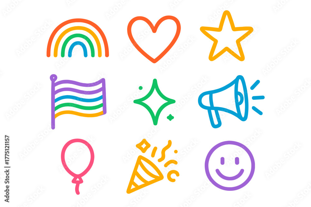 Photos Colorful icons of celebration and positivity featuring symbols like hearts and r
