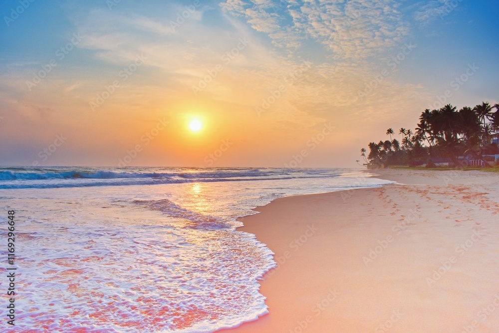 Tableau sur toile Colorful sunset viewed from the sea beach with soft waves and palm trees