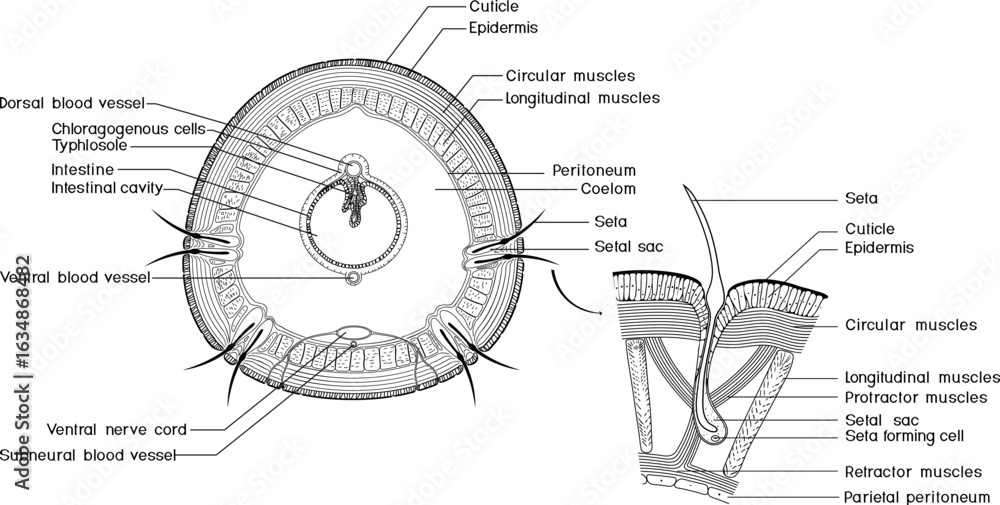 Tableau sur toile Coloring page with cross section and structure diagram of seta of earthworm