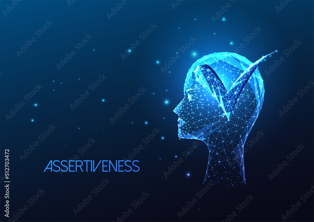 Tableau sur toile Concept of assertiveness, self confidence with check mark and human head on dark