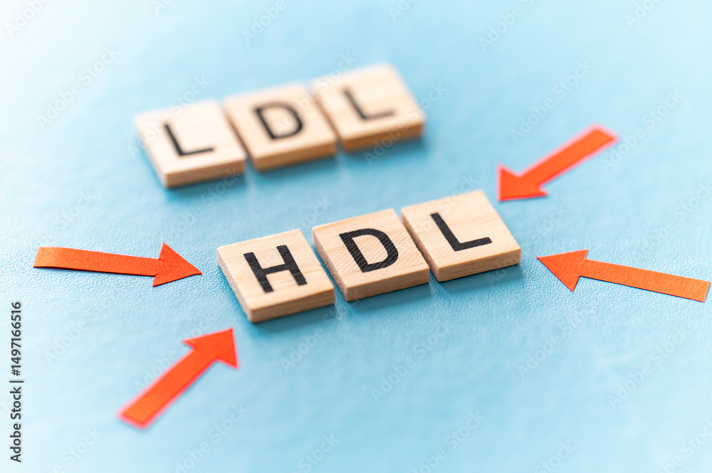 Photos Concept of difference between HDL and LDL cholesterol, with terms composed with wooden alphabet on a blue background, good cholesterol HDL