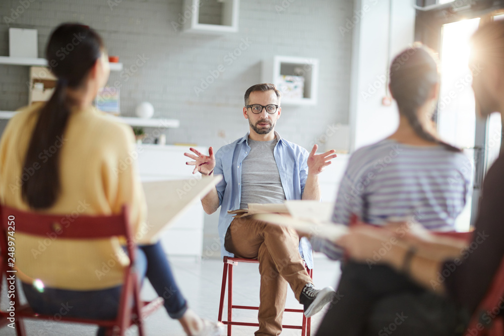 Photos Confident teacher explaining his students how to develop painting skill while gi