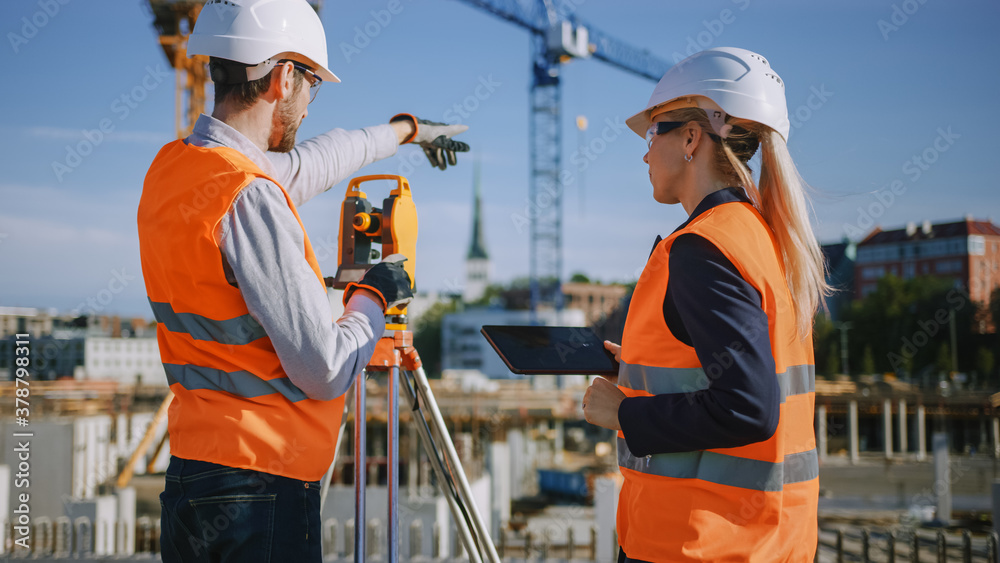 Tableau sur toile Construction Worker Using Theodolite Surveying Optical Instrument for Measuring Angles in Horizontal and Vertical Planes on Construction Site