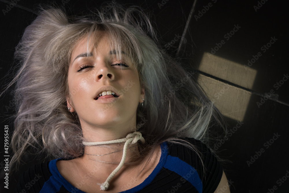 Photos Crime scene simulation: dead girl with hands tied lying on the floor