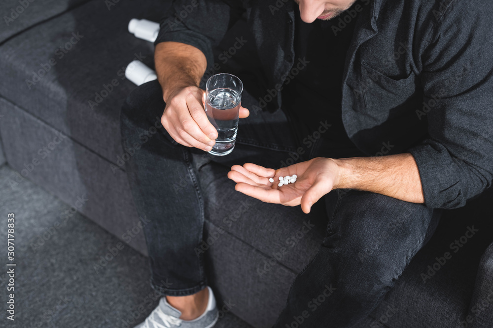 Tableau sur toile cropped view of man with panic attack holding pills and glass of water in apartm