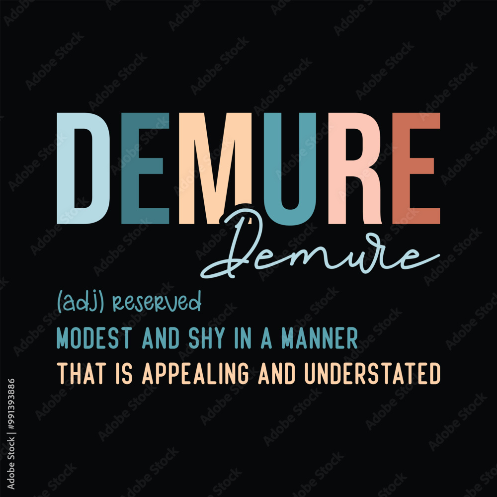 Photos Demure demure (adj) reserved, modest and shy in a manner that is appealing and u