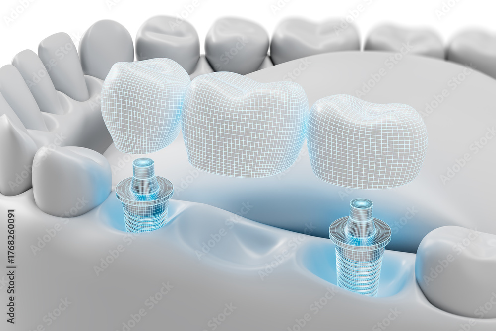 Tableau sur toile Dental implant bridge concept with 3D modeled artificial teeth and abutments on a white background showing modern prosthetic restoration process