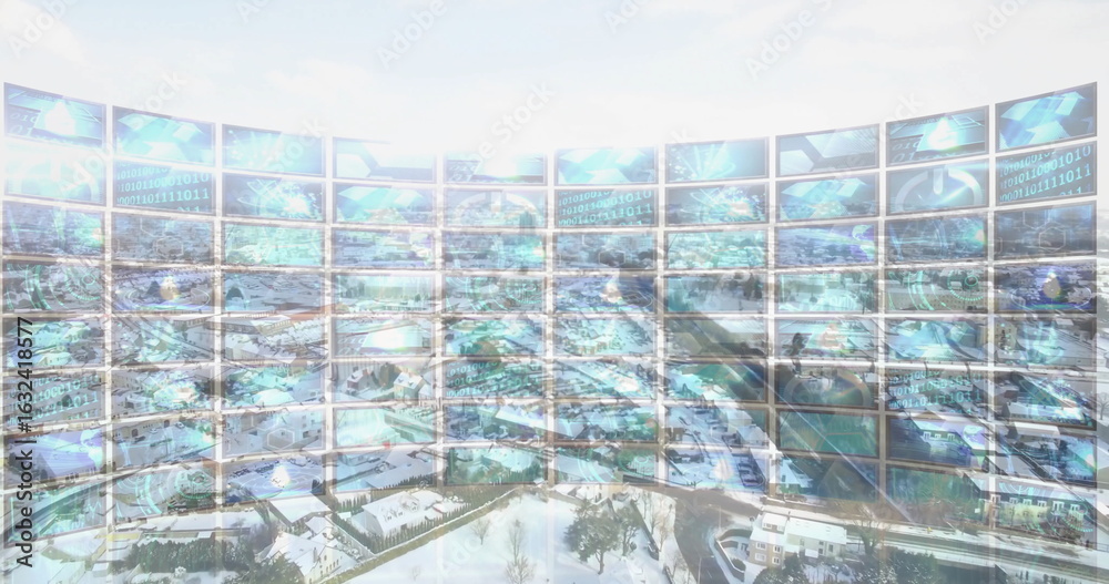 Tableau sur toile Displaying curved monitor wall projecting binary code and globes in control room