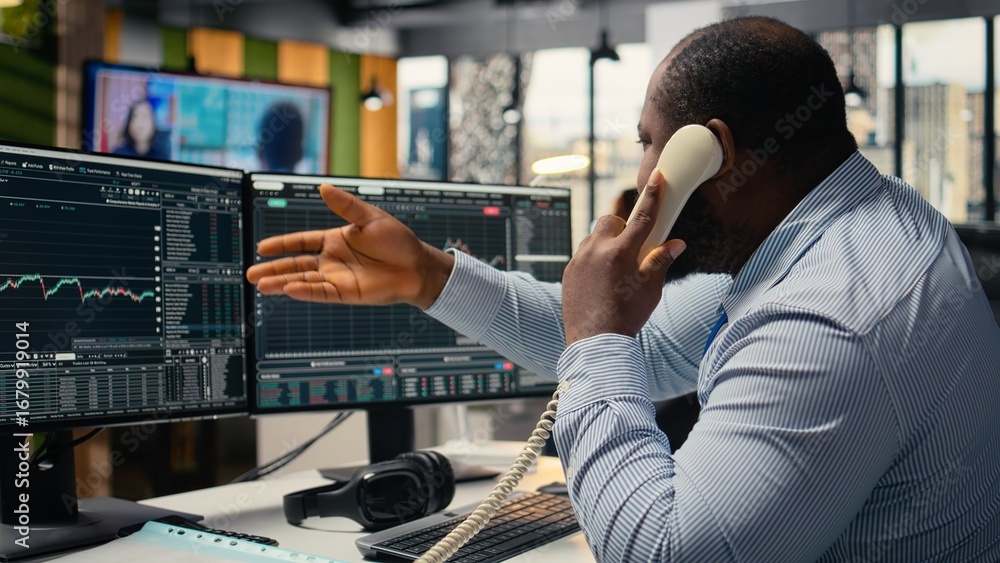 Photos Distressed brokerage firm trader making phone calls to clients in response to Black Swan event shock