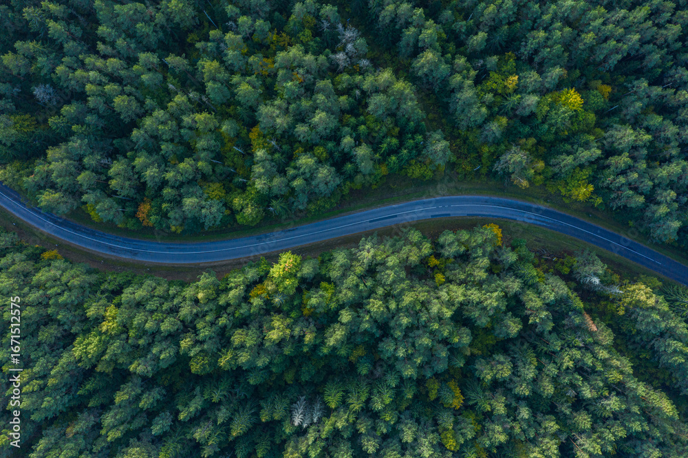 Tableau sur toile Drone aerial view of a winding forest road in Lithuania surrounded by dense gree