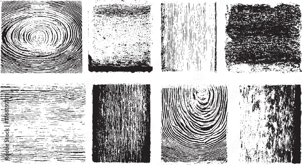 Photos Eight abstract black and white textures including wood grain and fingerprint patterns