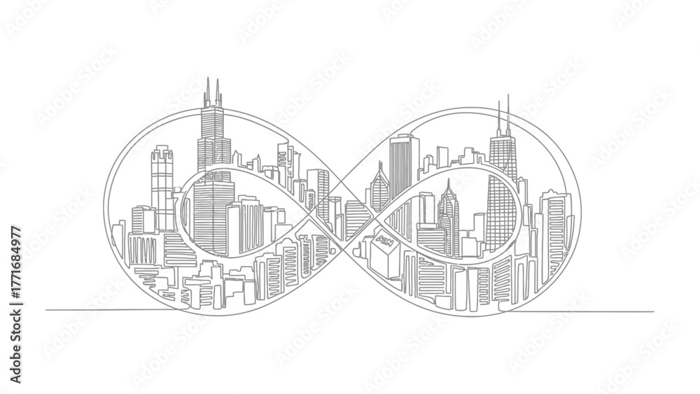 Tableau sur toile Endless City: An artistic illustration captures the perpetual motion of urban life, with a skyline intertwined in an infinity symbol, a testament to the unending cycle of growth and evolution