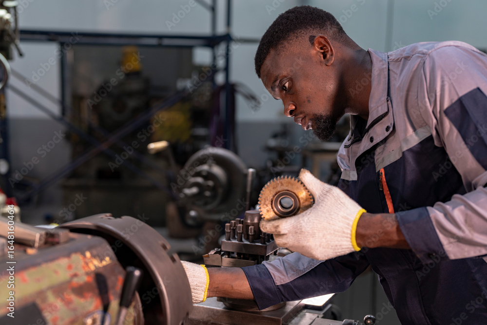 Photos Engineer closely inspecting precision components on a metal lathe machine