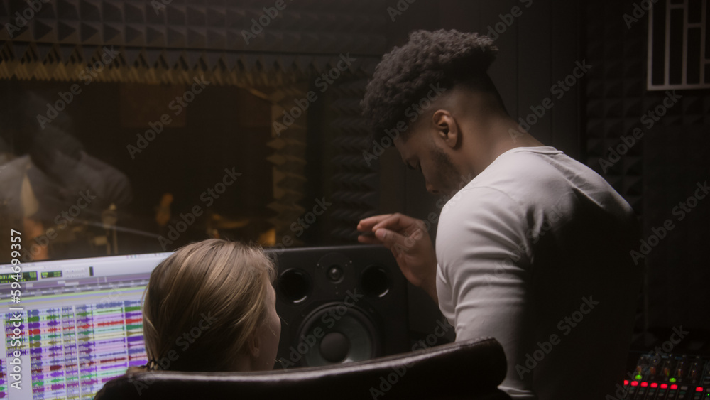 Photos Experienced audio engineer and African American producer work with singer in sound recording studio