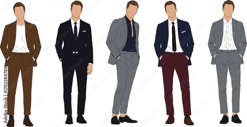 Tableau sur toile Five faceless men in modern stylish suits, standing casually with hands in pockets, fashion illustration, formal and semi-formal attire