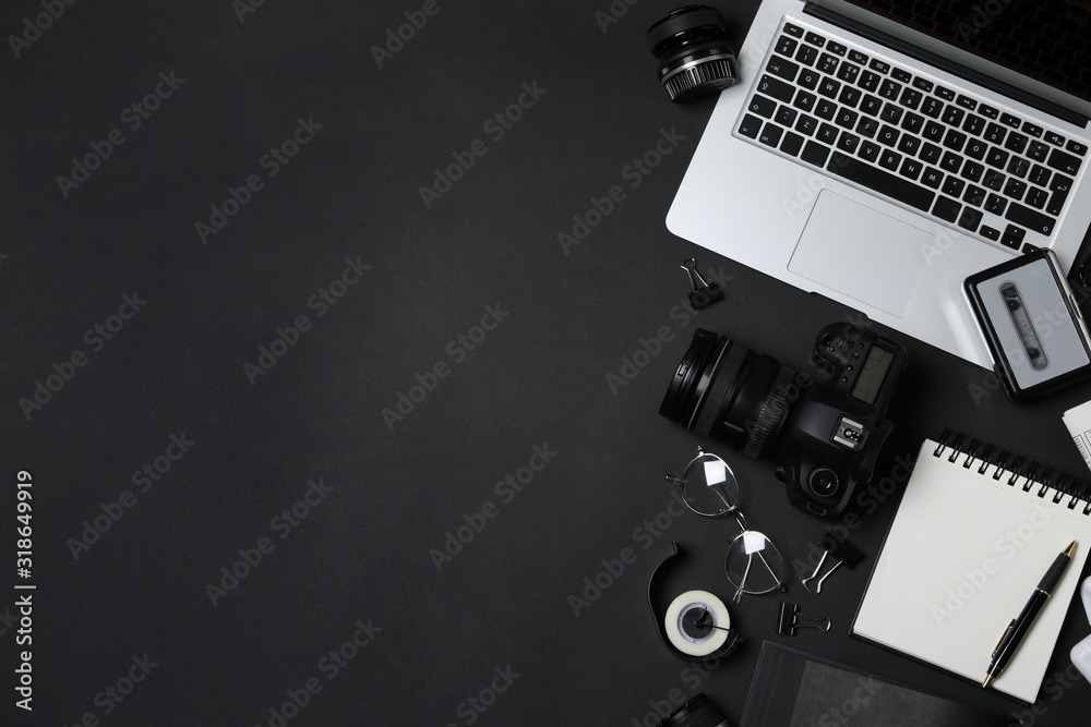 Tableau sur toile Flat lay composition with equipment for journalist on black background