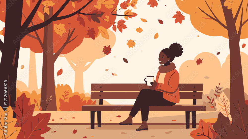 Tableau sur toile Flat Vector Autumn Illustration of Woman Sitting on Park Bench with Coffee Autum