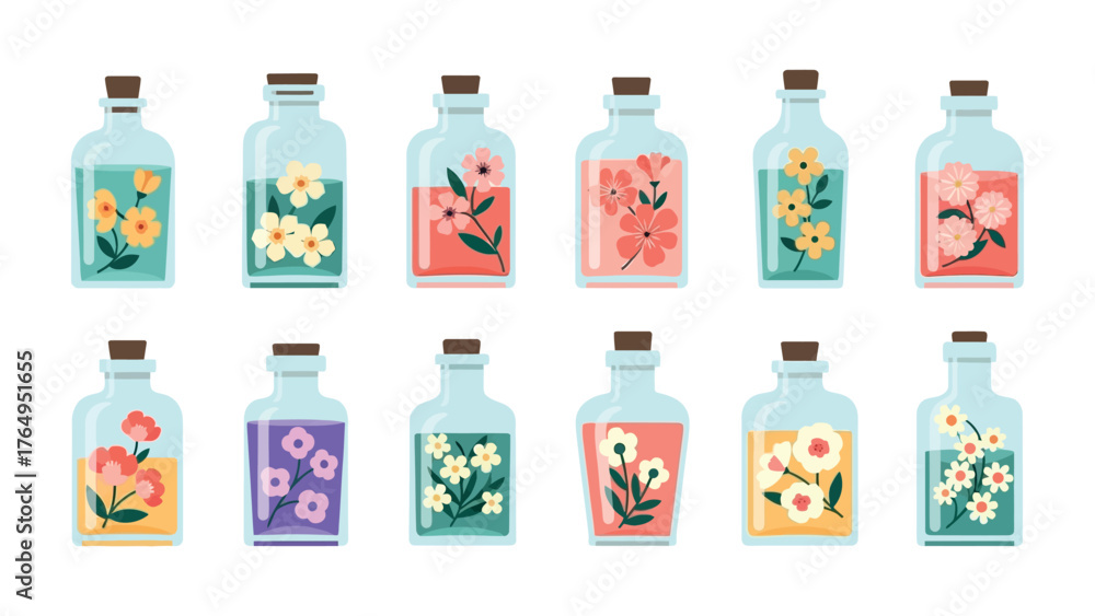 Photos Floral Apothecary Bottles: A collection of exquisite apothecary bottles each containing a unique array of vibrant floral arrangements