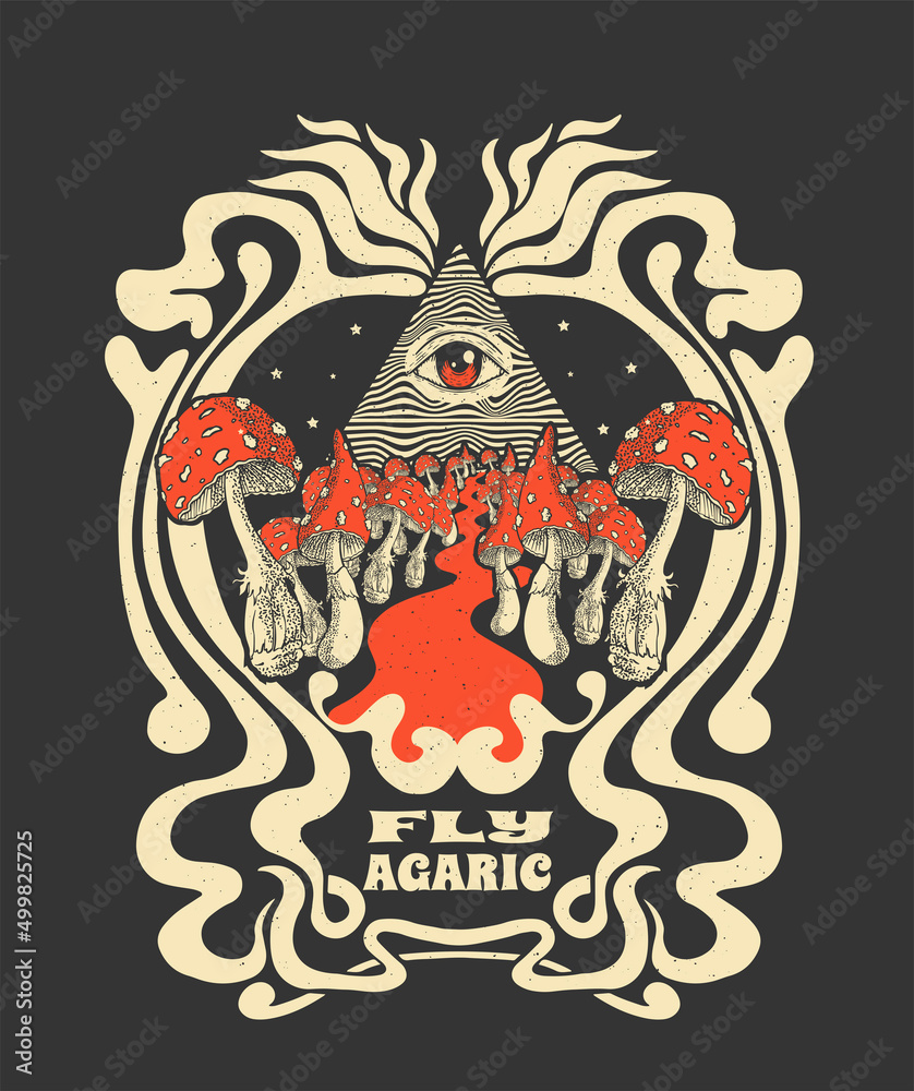fly agaric and masonic pyramid, psychedelic journey, t-shirt print, retro style poster