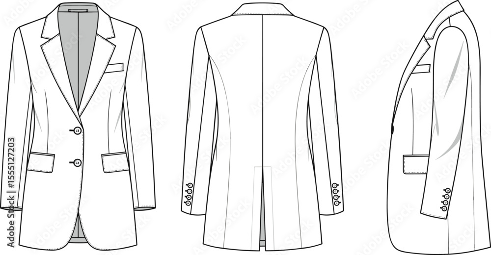 Photos Formal blazer front, back and side view, fashion cad sketch, flat vector templat