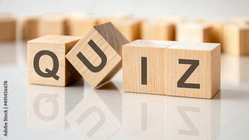 four wooden blocks with the letters quiz on the bright surface of a gray table, business conceptual word collected of of wooden elements with the letters