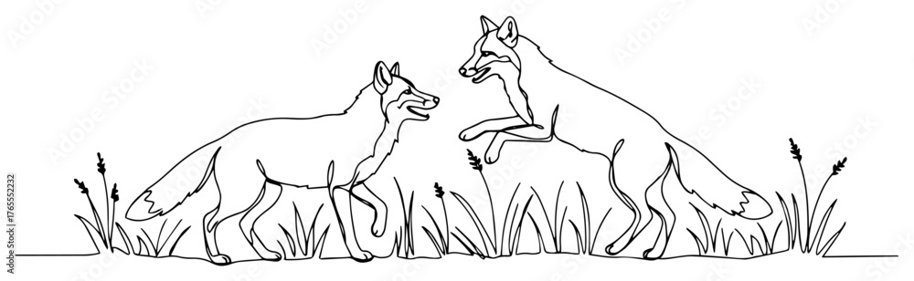 Tableau sur toile Foxes sparring in meadow continuous one-line vector illustration minimalist outl
