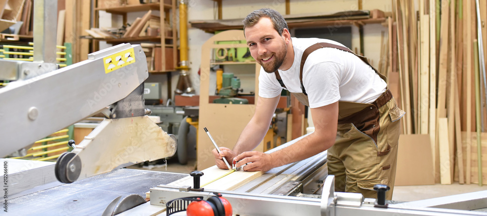 Photos friendly carpenter with ear protectors and working clothes working on a saw in t