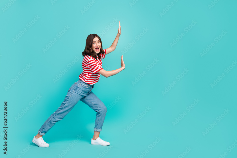 Tableau sur toile Full length photo of positive lady hold empty space push imaginary stone large p