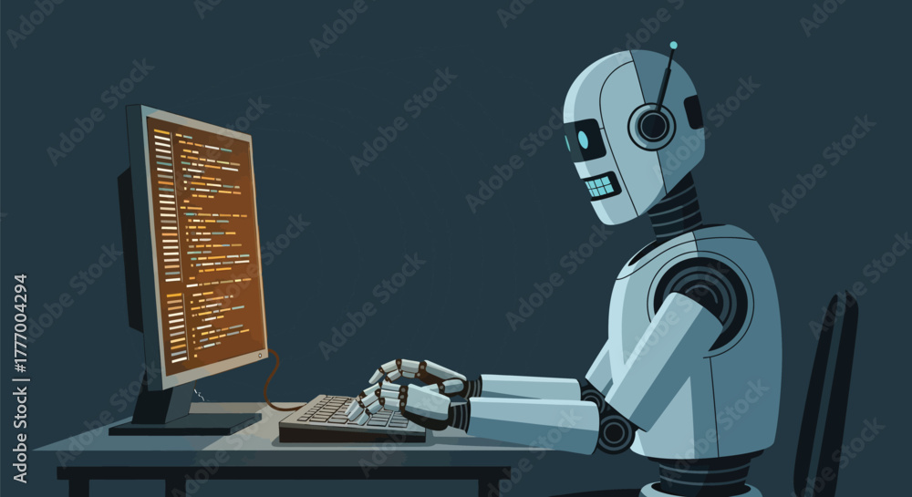 Photos Futuristic robot diligently coding complex algorithms on a glowing computer scre
