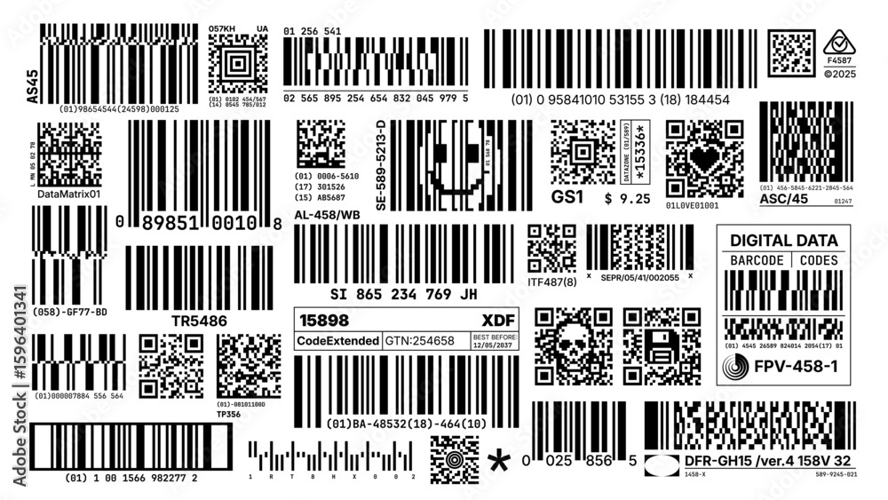 Photos Futuristic set of barcode, QR code and Data Matrix labels in black and white, st
